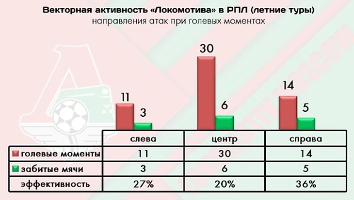4. В векторном плане атака москвичей достаточно сбалансирована. По итогам минувшего чемпионата с фланговых направлений было забито лишь на два мяча меньше, чем через центральную зону (16 против 18; для сравнения аналогичное соотношение у «Зенита» - 28 против 27). На старте нынешнего векторные пропорции пока сохраняются.