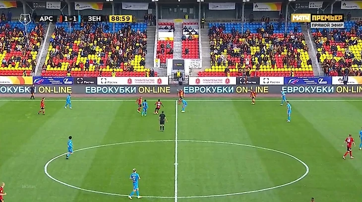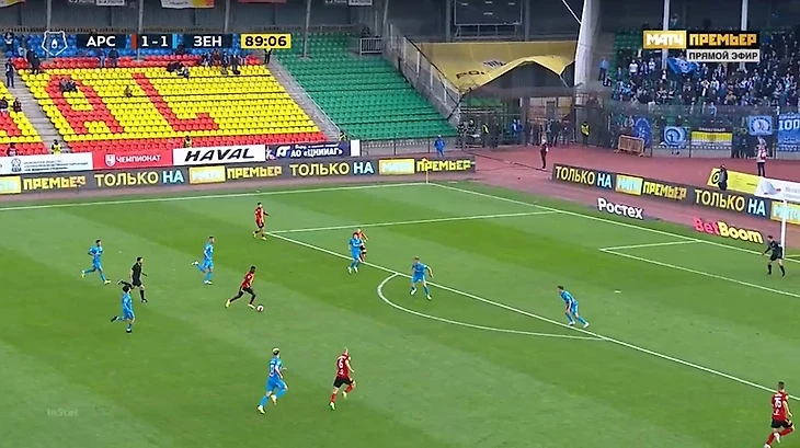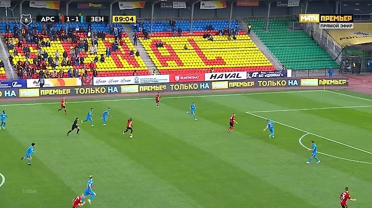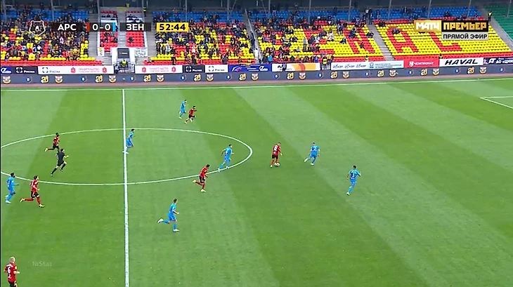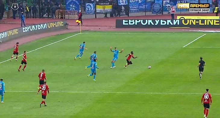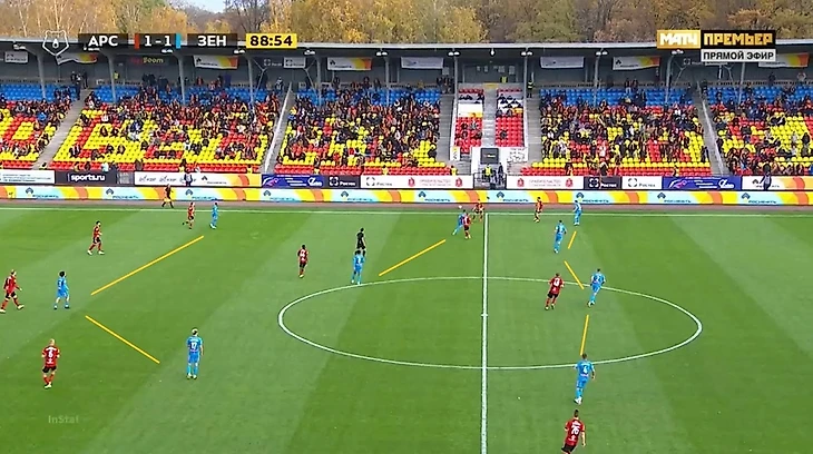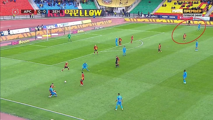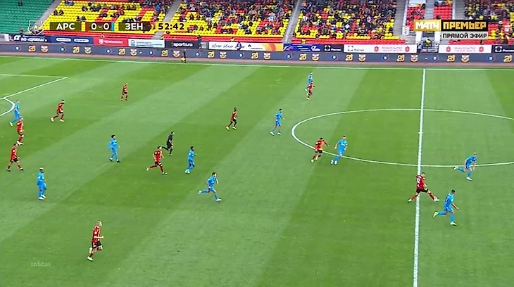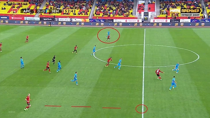 Все начинается с неудачной передачи Кругового на Малкома, которую перехватывает Смольников. В этот момент на противоположном фланге Сутормин в максимально широкой позиции за спиной Зурико – и ближе к воротам «Арсенала», чем его потенциальный оппонент. Очевидно, это как раз то, что требует от латераля тренерский штаб.