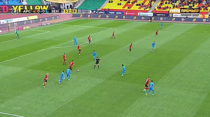 Сразу после ответного гола «Зенит» идет в прессинг, Дзюба провоцирует вынос Коченкова – передача идет на фланг на Степанова.