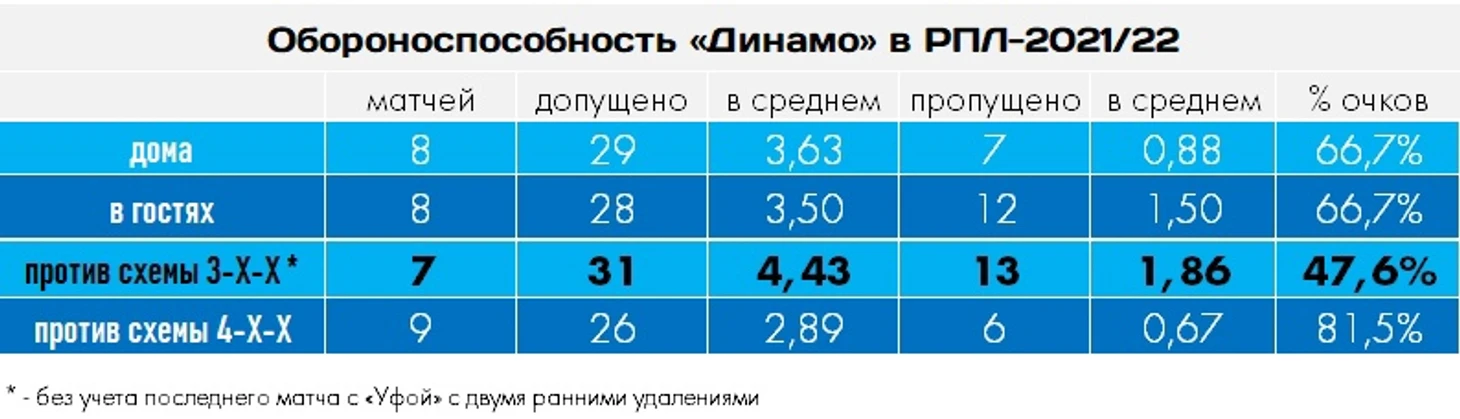 В целом по сезону динамовцы продолжают демонстрировать стабильно высокий уровень созидательной активности, хотя дома выглядят чуть предпочтительнее, чем на выезде. В то же время против команд, использующих структуру 3-Х-Х, проблем у команды Шварца все-таки больше.