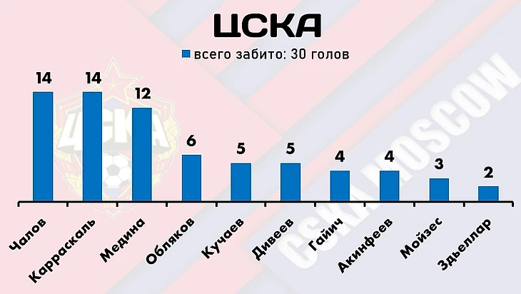 У ЦСКА вся атака держалась на трио Чалов-Карраскаль-Медина, которые общими усилиями организовали 25 голов, забив при этом 21 из них. Соответственно, совокупный голевой вклад остальной команды оказался одним из самых слабых в лиге (8/30 – лишь 27%; меньше только у «Оренбурга» - 24%) – во многом из-за скверной реализации. Так, например, если тройка Ч-К-М за вычетом 11-метровых реализовала 9 из 24 явных голевых шансов (38% - не супер, но приемлемо), то вся остальная «группа поддержки» – лишь 2 из 17 (12%).