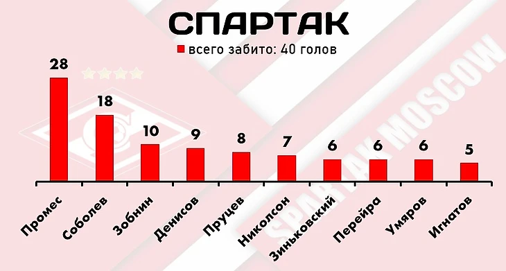За 17 туров «Спартак» настрелял уже на 3 гола больше, чем за весь прошлый чемпионат, и пока идет на командный рекорд в рамках РПЛ. Погоду здесь по большей части делают Промес и Соболев, причем текущая «промесозависимость» красно-белых в голевом выражении – самая серьезная в лиге (28/40 – 70% голов с участием; вторым идет Ранджелович из «Урала» - 13/21, 62%).