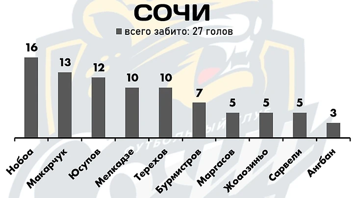 Еще один примечательный факт: сразу 5 игроков «Сочи» добрались до отметки 10+ голевых соучастий – больше только у «Зенита» (7), забившего аж на 20 мячей больше.