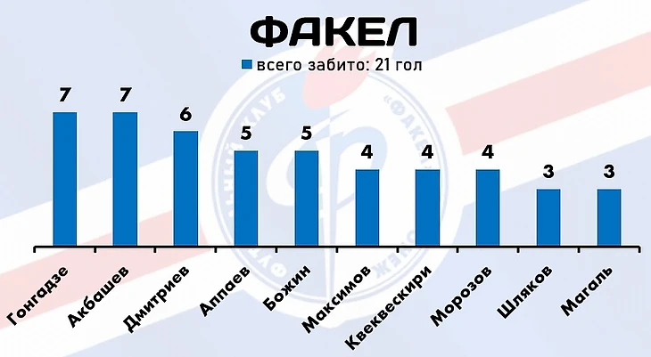 «Факел» больше половины своих голов забил после розыгрыша угловых и штрафных, поэтому в топ закономерно попали два основных исполнителя стандартов (Дмитриев и Акбашев) и шестеро гренадеров с ростом 185+.