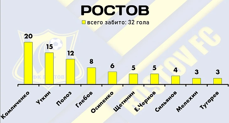 Еще один ключевой игрок «Ростова» - Даниил Уткин, отбегавший все 17 матчей без замен (кстати, как и его напарник Глебов) и организовавший почти половину голов своей команды. Во многом благодаря Уткину дончане больше всех в лиге забили после стандартов - 12 голов / 8 с участием.