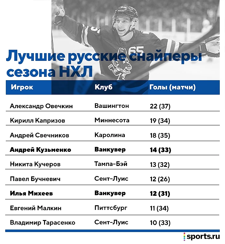 На счету Михеева теперь 22 (12+10) очка в 31 матче – это шестой показатель в «Ванкувере». У Кузьменко уже 30 (14+16) баллов в 33 играх, и он делит третью строчку в списке бомбардиров «Кэнакс» с Джей Ти Миллером. Оба наших форварда идут в топе русских снайперов сезона, и в первой семерке только они представляют один клуб.