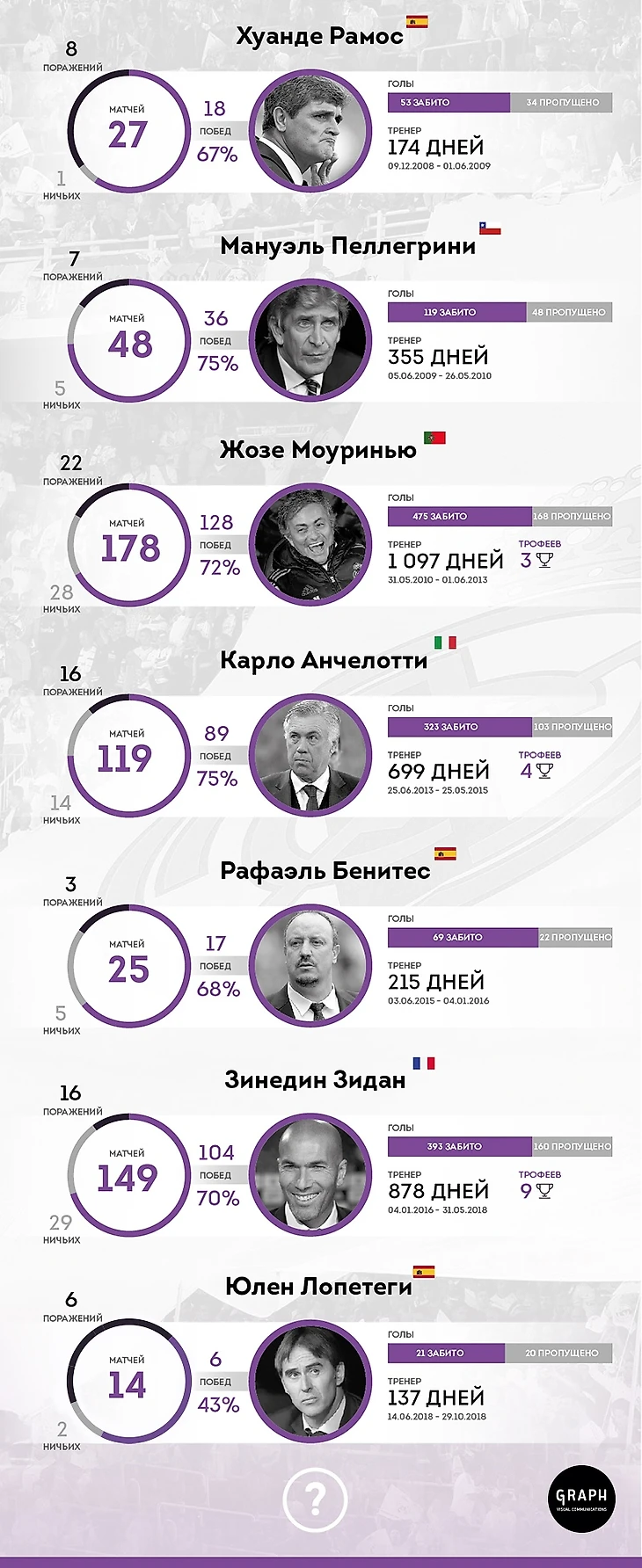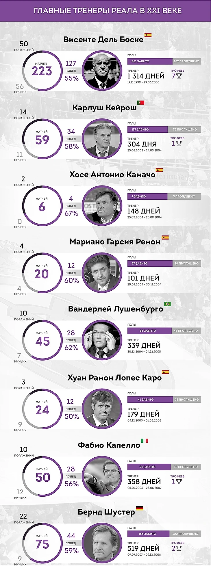 Кто станет новым главным тренером? Вопрос очень интересный и сложный. Оставляйте свое мнение в комментариях и опросе, а пока мы подготовили для вас инфографику о всех тренерах Реала в 21 веке.
