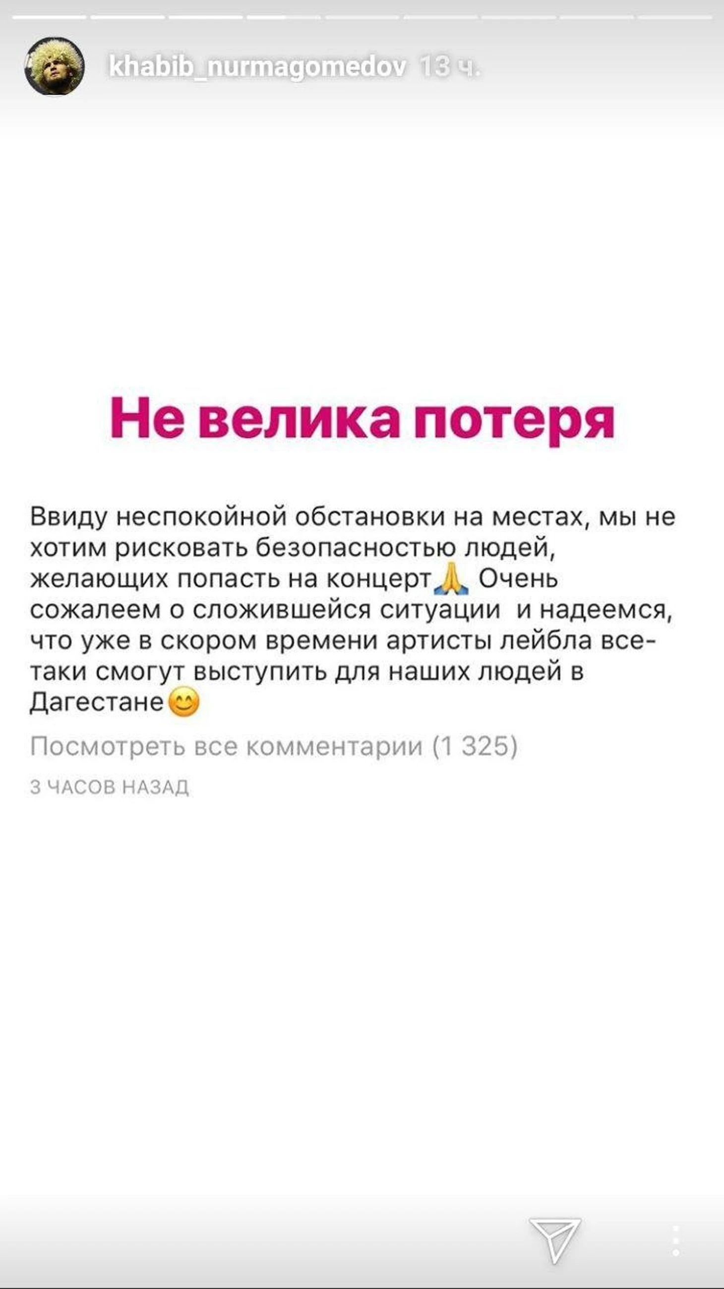Чемпион UFC из Дагестана Хабиб Нурмагомедов опубликовал в инстаграм-сториз скрин с заявлением организаторов об отмене концерта и подписал: «Невелика потеря».