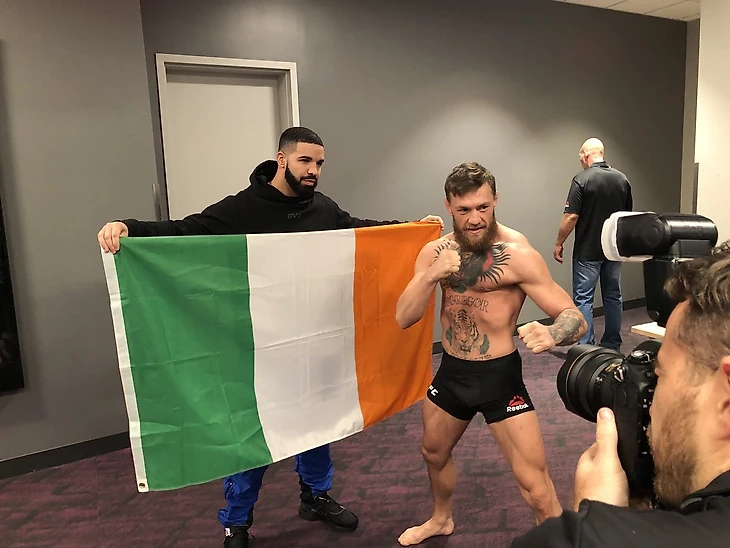 Первым на сцене появился МакГрегор – в сопровождении канадского рэпера Дрейка, который укутался в ирландский флаг.