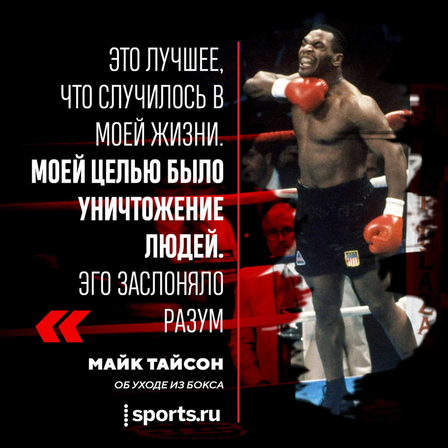 • Лучшее, что со мной случилось в жизни, – это уход из бокса. Моей целью было уничтожение людей. Эго заслоняло разум. «Я – Тайсон! Сильнейший человек на земле», – и всякая другая хрень.