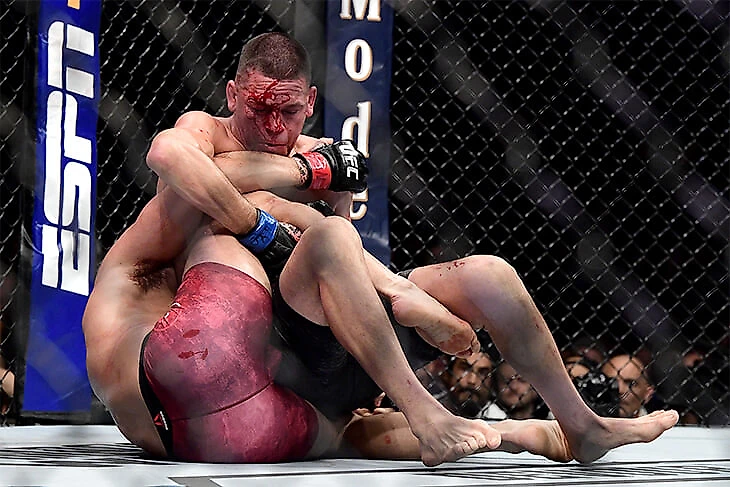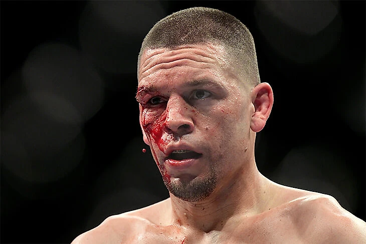 Врач остановил бой из-за не самого дикого рассечения Диаса. Конечно, выглядит страшно, но с такими в MMA дерутся – это не суммарный тоннаж ударов по голове, когда боец не может стоять на ногах. Нэйт начал прибавлять по ходу поединка, а до конца оставалось всего два раунда – то есть 10 минут.
