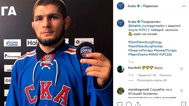 Футболом Хабиб не ограничивается. Прошлой осенью он притопил за хоккейный СКА, в декабре заглянул на матч питерской команды против ЦСКА и провел символическое вбрасывание.