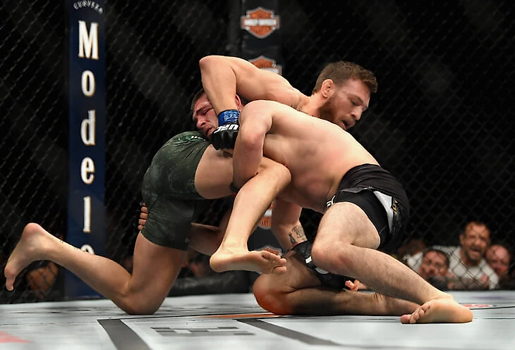 Оказавшись под соперником, Конор паникует. Дастин – вспоминает джиу-джитсу