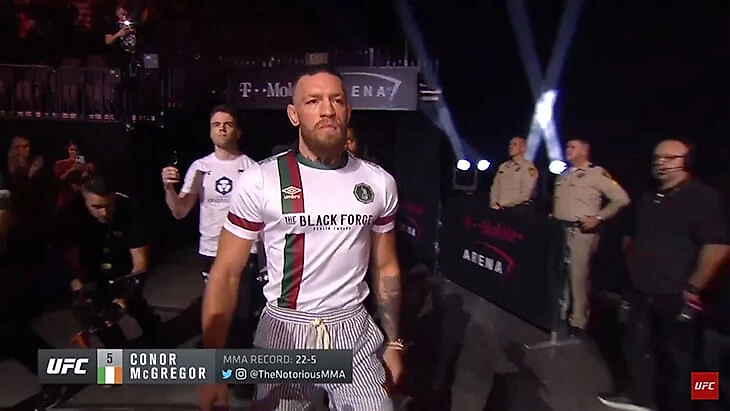 Но все оказалось прозаичнее: на футболке написано название новой сети пабов Конора, а сама форма – принадлежит будущей одноименной футбольной команде «Блэкфордж». На взвешивании Конор презентовал и гостевой комплект формы – белый, не менее эффектный.