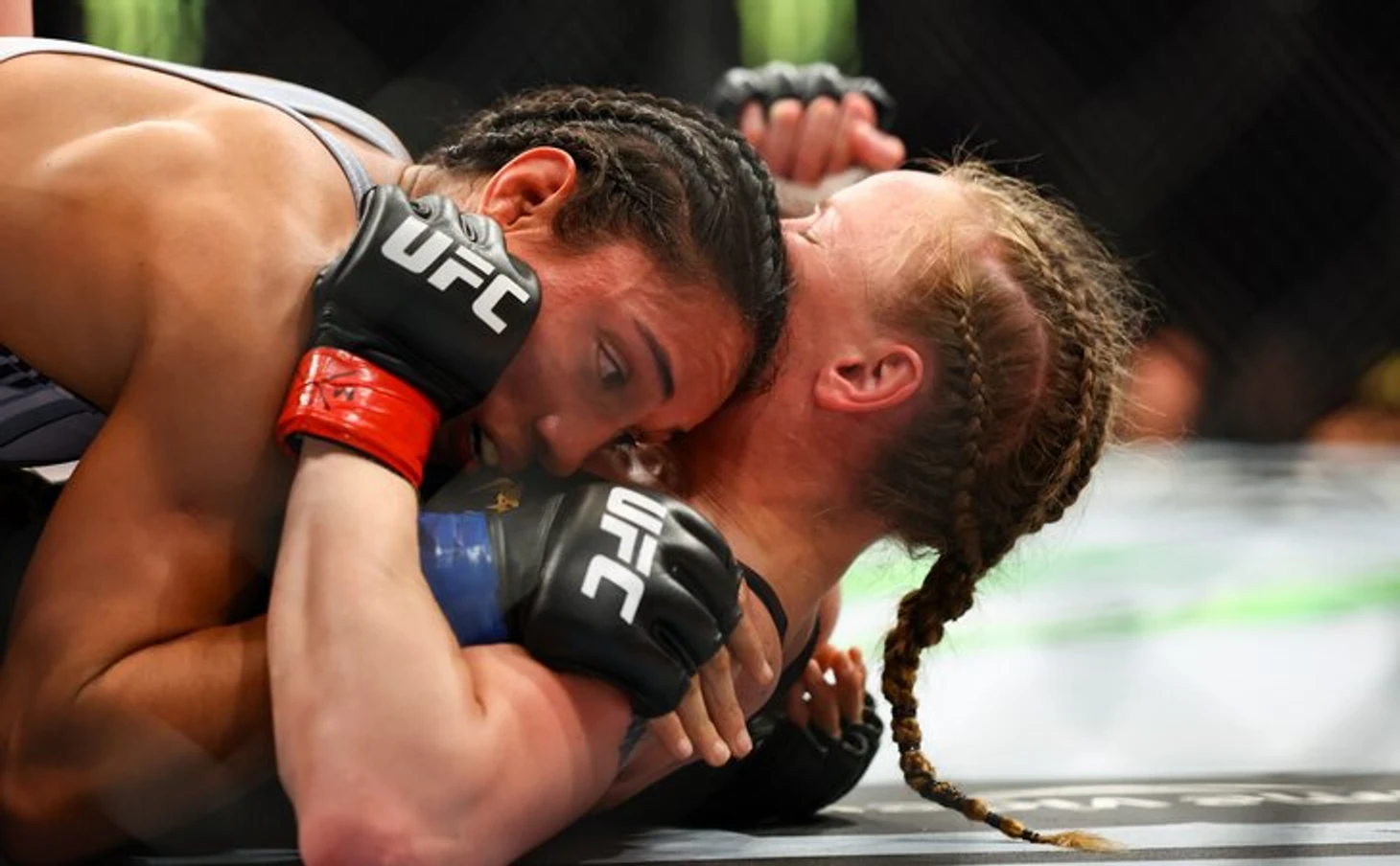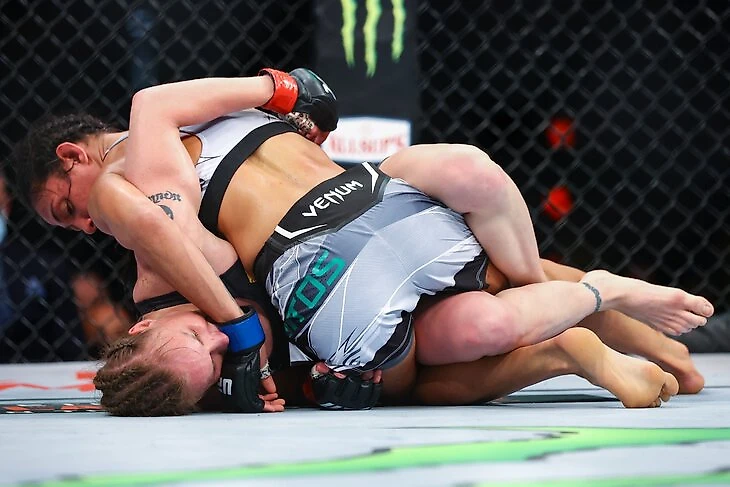 А вот за две минуты до конца Сантос взорвалась, зажала Шевченко у сетки, где перевела и забрала спину. И снова флэшбеки боя Яна и Стерлинга: Сантос не наносила удары, а охотилась за удушающим. У Таилы уже набухала гематома вокруг правого глаза, но Шевченко было хуже – бразильянка душила ее, а чемпионка закрывала шею подбородком.