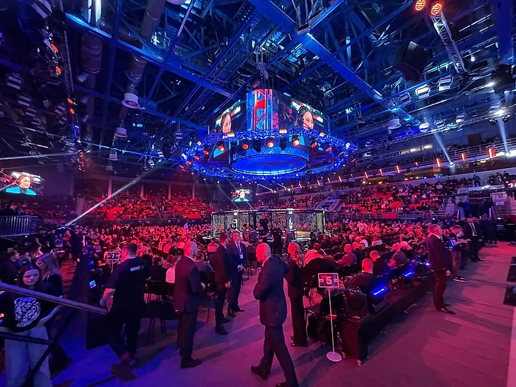 Шикарная атмосфера на арене! В разгаре основной кард турнира. Александр Грозин победил судейским решением Илью Ерастова. А следующим подерется экс-боец UFC Алексей Кунченко.