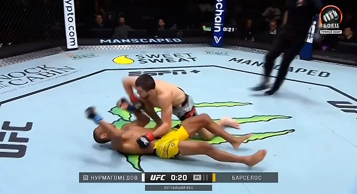 Главный кард открывал бой Умара Нурмагомедова и Раони Барселоса. Двоюродный брат Хабиба дерется в легчайшем весе и уже три раза победил в UFC. И стал первым членом команды, который подрался в лиге без Хабиба в углу – после его окончательного ухода из ММА.