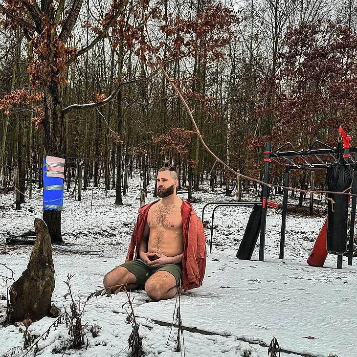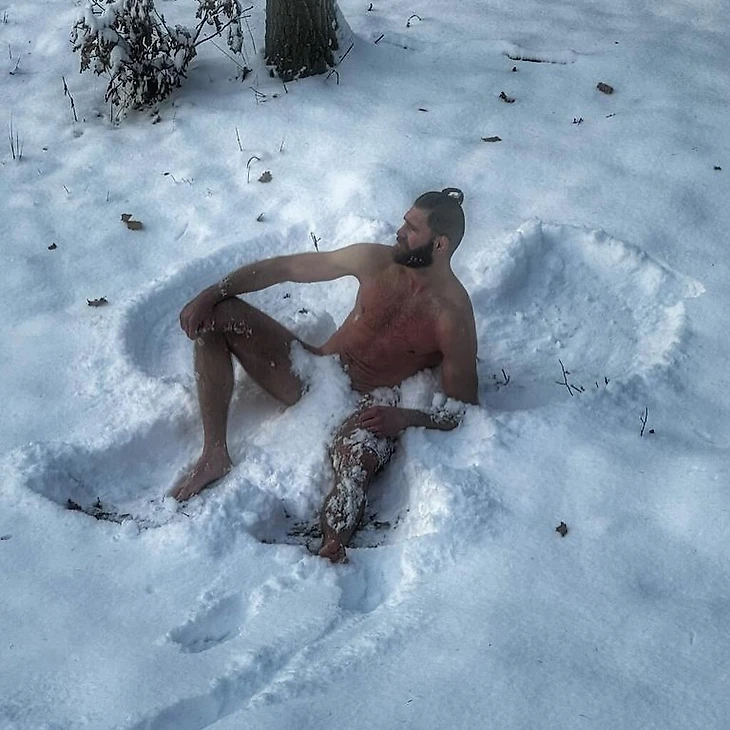 • Валяется голым в снегу и купается в ледяной воде в лесу.
