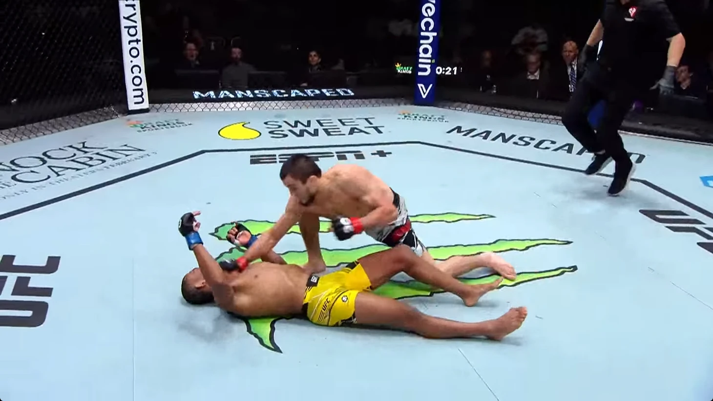 Алмахан – дебютант, показавший высокий уровень уже в первом бою. Это напомнило поединок Мовсара Евлоева против дебютанта Диего Лопеса, которого никто не знал, но сейчас он в топе. Алмахан доставил проблем Умару, отправив в первом раунде в нокдаун. В итоге Нурмагомедов заборол казахстанца, уверенно победив судейским решением (взял два раунда со счетом 30-28), но в стойке испытывал проблемы.
