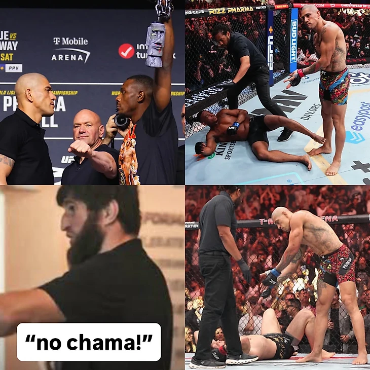 Алекс Перейра вернул себе пояс UFC, за 1,5 минуты нокаутировав Магомеда Анкалаева. После победы Перейра показал фирменный жест блогера Хаби Лейма, который в роликах высмеивает бесполезные лайфхаки из интернета, показывая поднятые вверх ладони.