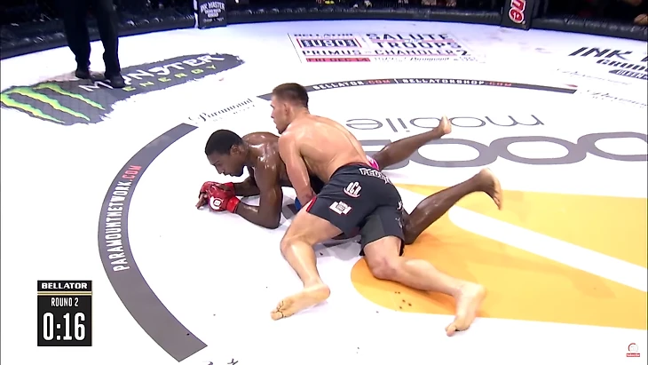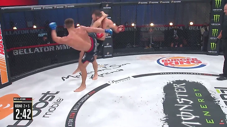 Хоть Немков и базовый самбист, есть ощущение, что борьба для него не то чтобы первое решение в любой ситуации. Но если появляется удобная возможность для прохода – он ее использует. Качественный тайминг и неплохое исполнение тейкдаунов, особенно с замком на корпусе – в итоге эффективность его переводов, по ощущениям, приближается к 50%.