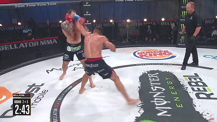 Что важно, Немков не бросает удары ногами без подготовки, а собирает их в комбинации. Подсоединяет лоу-кики после двоек и троек, пробивает серию из киков с разных сторон или выдает подобные нокаутирующие сочетания «рука-нога»: