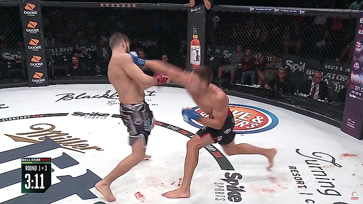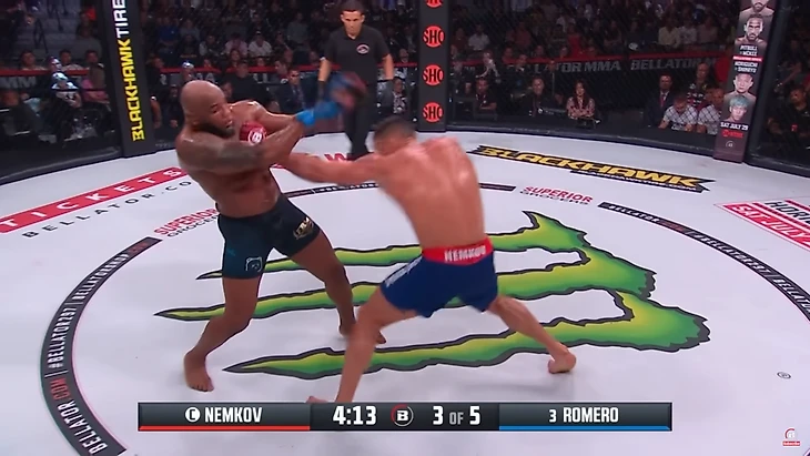 Немков замечает это и выбрасывает правый хай-кик навстречу его движению