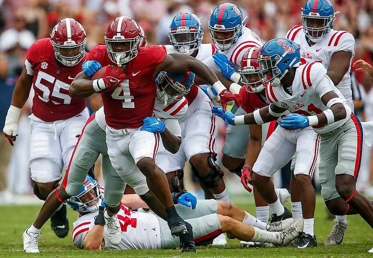 Другой лидер американского футбола, действующий чемпион - Алабама, играла с Оле Мисс, одной из самых атакующих команд лиги (прошлый сезон 63-48), и вообще мало кто может набрать 40 очков с Алабамой, обычно это удаётся как раз игрокам из Оксфорда, Миссисипи. Тем более, как и в случае Арканзас-Джорджия, тренер андердога работал в штабе соперника тренером атаки. Считается, что именно Люк Киффин заложил основу революции игры Алабамы от аккуратной оборонительной к атакующей. А квотербэк Мэтт Коралл для игры, которую строит Киффин просто находка, да в качестве ресиверов у него не такой большой выбор, но он как и Риддер в числе фаворитов на Хэйсман трофи и что немаловажно для команды не первого эшелона является "dual-threat"-квотербэком, то есть способен не только пасовать, но и брать на себя функции раннинбэка, являясь одним из лидеров команды по этому показателю. И он проявил себя оформив три тачдауна против самой Алабамы, но... было это уже при счёте 0-21 и Алабама уверенно оформила победу 42-21, практически не заметив сопротивления от одной из сильнейших команд западного дивизиона SEC и топ-15 команд лиги. Перед матчем Киффин, кстати, попросил приготовить попкорн, намекая на битву, попкорн после игры принёс Ал, слон-маскот Алабамы. Киффин за цитату извинился и поблагодарил Алабаму за доставку.