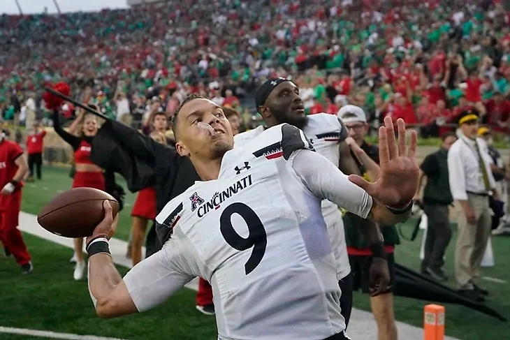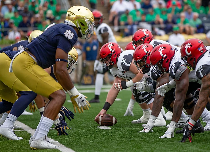 Этой тактики и придерживается Цинциннати -- сезон без поражений в ковидный год, поражение от очень высоко котирующейся Джорджии на последних минутах и расписание на 2021 год, которое включает Индиану и Нотр Дам. Индиана была обыграна на 4 неделе и что важно в этом сезоне она выступает неважно, не попадая в топ-25, а значит и вес победы над ней сильно меньше. Нотр Дам же, в прошлом году присоединившийся к Атлантической конференции, и в итоге попавший в плей-офф (с одним поражением в финале конференции от Клемсона, но с победой над ним же в регулярке) до старта сезона был около топ-10, и хоть и не без труда, но одержал 4 победы на старте, закрепившись в топ-10. Там же было и Цинциннати, так что нас ждал матч двух топ-10 команд (один из двух на пятой неделе), первый в истории Цинциннати. Перед игрой Нотр Дам (№9) не мог рассчитывать на своего основного квотербека, перешедшего из Висконсина, а Цинциннати (№7) напротив не только имеет на этой позиции одного из претендентов на трофей Хейсмана лучшему игроку (Дезмонд Риддер), но и одну из лучших оборон в стране. Другая проблема Нотр Дам перед игрой, и вообще сезоном -- на драфте этого года в НФЛ команду покинуло большинство игроков атакующей линии, которые блокируют соперника пока квотербека подбирает направление для паса. Предстартовым фаворитом была команда из Индианы, но менее чем на тачдаун и то за счёт домашнего поля, которая помимо прочего выписала соперникам за поездку в Саус Бенд чек на более чем миллион долларов. Домашнее поле ирландцев одно из самых шумных и также Нотр Дам не уступал на нём уже 26 игр, тренер зелёных накануне оформил рекордную победу во главе команды во всей её истории, тем более вирусным стало высказывание Риддера, который отметил, что фанаты Нотр Дама не буду шумными слишком долго, намекая на агрессивное начало матча. За свои слова Риддер ответил (19 точных передач на 32 попытки), после осторожного начала матча в первой четверти, во второй он оформил два паса на тачдаун и позволил команде заработать право на голевой удар - 17:0 к перерыву. Вторая половина прошла спокойнее и под контролем После матча тренер команды из Огайо отметил: "мы не просто обыграли топ-10 команду, мы обыграли топ-5 программу". Для Нотр Дам шансы на топ-4 растворились, но финиш в топ-10 возможен и значит сильный соперник в боул и вновь высокая позиция на следующий год под нескончаемый рефрен, что Нотр Дам переоценён.