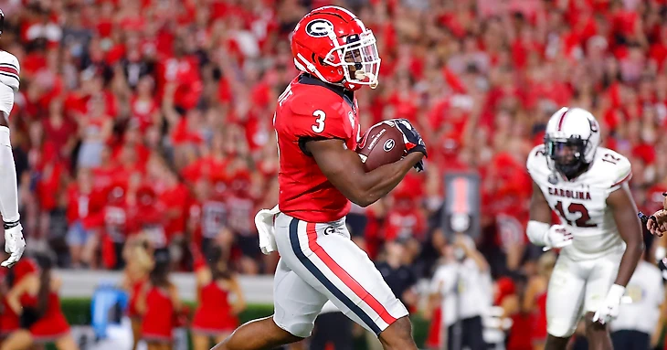 В другом матче топ-10 команд идущая второй Джорджия принимала Арканзас, разместившийся на восьмой строчке. Несмотря на близость команд в рейтинге букмекеры предсказывали победу Джорджии с отрывом в 21.5 очка, то есть три тачдауна. Джорджия из-за травмы спины лишилась своего основного квотербека Дэниэлса, место которого занял квотербек Стэтсон Беннетт IV. Он неожиданно стал основным в прошлом сезоне из-за того что Дэниэлс не успел восстановиться от травмы колена, а Ньюмен, другой перешедший квотербек, воспользовался опцией пропуска сезона из-за ковида (что ему потом и аукнулось на драфте). Беннетт по всем параметрам средний квотербек, он был далеко не в топ-300 заканчивая школу, ему пришлось играть без стипендии и год в небольшом колледже. Тем не менее он достаточно надёжен, а монструозная линия обороны и атакующие блокирующие игроки Джорджии позволяют квотербека иметь больше свободы. Тем не менее именно Беннетт двумя неделями ранее оформил пять пасов на тачдаун (повторение рекорда университета) всего за половину игры, выполнив 11 передач, 10 из которых были точными. Невероятные цифры против не самой слабой команды (Университет Алабамы в Бирмингеме). Ожидалась достаточно атакующая игра, ведь тренер Арканзаса был тренером атака Джорджии совсем недавно и квотербэк и ресиверов команды выступают очень хорошо. Вопреки ожиданиям Джорджия положилась на своих раннинбэков. Они не подвели, полностью уничтожив оппонентов - более 200 ярдов атаки, 21-0 к концу первой четверти и 37-0 в итоге с тремя тачдаунами Замира Уайта, один из которых был после блокированного панта (выноса).