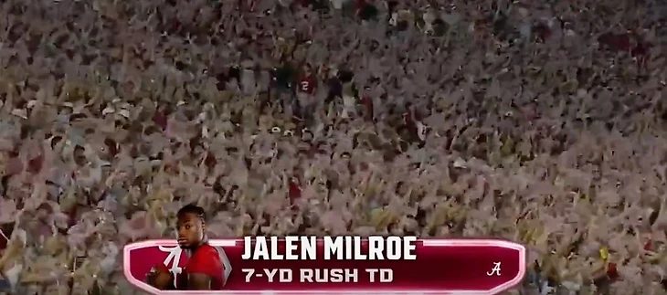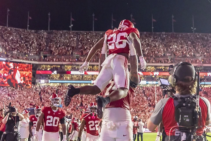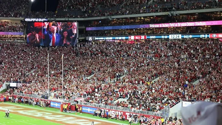 И вот главный матч дня - Джорджия против Алабамы, Джален Милро против Карсона Бека. И Кирби Смарт против, постойте, против Кален ДеБоира, кого? Ник Сабан завершил грандиозную карьеру и Алабама назначила рулевого Вашингтона новым тренером. И вот, огромная полностью заполненная арена вместе с бывшим президентом Дональдом Трампом приготовилась смотреть битву второй и четвёртой команд рейтинга.