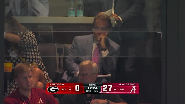 Только лишь затем, чтобы Джихад Кэмпбелл сделал перехват - хотя и делать особо ничего не пришлось, Бек бросил мяч ровно ему в грудь. Алабама получает супер-короткое поле в 25 ярдов. Но Дэн Джексон делает ответный перехват, мяч отскочил ровно к нему от принимающего Алабамы. Мяч у Джорджии, есть чуть менее двух минут, и что важно первое владение во второй половине, надо сокращать до двух владений и затем пытаться занести в третьей четверти, сделав счёт 28-21. Идеальный сценарий всем очевиден, но случился худший. Защитники Алабамы накрыли Бека в зачётной зоне, он беспомощно швырнул мяч куда-то, где и не пахло принимающими, судьи пошли смотреть момент. Это сейфети, квотербек не контролировал мяч бросая его абы куда. Верное решение судей. Два перехвата и сейфети лишь за половину игры. На трибунах выхватили Ника Сабана, так Джорджию Кримсон Тайд не раскатывали даже при нём. Пятый тачдаун Алабама не занесла Эванс III допустил фамбл. Бек проснулся и сделал три паса на 56 ярдов, но время первой половины вышло. Его визави был безупречен, Милро сделал 9 из 9 и ещё занёс два тачдауна сам. Кирби Смарт - подытожил в перерыве, что нужна перезагрузка.
