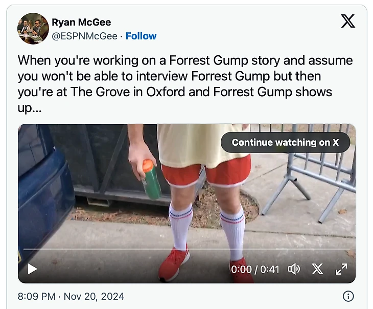 Тачдаун этой истории случился как раз тогда, когда «Здесь» вышел в кинотеатрах. 8 ноября в Оксфорде, штат Миссисипи, накануне неожиданной победы Миссиссипи над Джорджией, пытаясь объяснить посыл этой истории своему медиа-приятелю, автор (Райан МакГи) сетовал: «Единственное, чего не хватает, — это возможности поговорить с самим Форрестом Гампом».