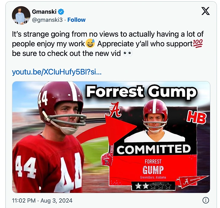 Когда возрожденная видеоигра EA Sports College Football вышла в этом году, Мангрум кропотливо создал Форреста Гампа — рейтинг скорости 99 и минимальный возможный рейтинг интеллекта — добавил его в текущий состав Багрового Прилива и вручную прогнал всех игроков Алабамы в сезонном режиме, чтобы посмотреть, что из этого выйдет.