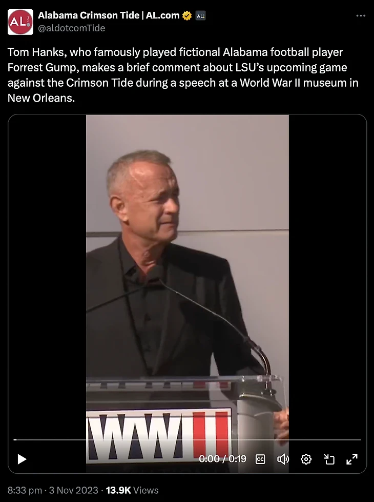 Мы попытались взять интервью у человека, который сыграл Гампа в момент, когда Том Хэнкс занимался промоушеном своего последнего фильма «Здесь», также снятого Земекисом и с актрисой, которая играла девушку Гампа -- Дженни, Робин Райт. Его краткий ответ был напоминанием о том, что он не эксперт по навыкам игры в американский футбол. Он больше бейсболист. Хотя стоит отметить, что он нанес жестокий удар от имени своей фальшивой альма-матер перед прошлогодней игрой Алабамы с Луизианной.