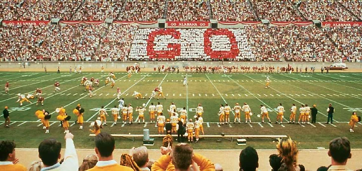 Если вы настоящий поклонник Гампа — а судя по кассовым сборам фильма в размере 678 миллионов долларов, и 2,5 миллионам проданных копий книги Уинстона Грума, которая и легла в основу фильма, очень оживленным продажам недавнего переиздания на Blu-Ray в честь 30-летия выхода, не говоря уже об очереди людей, которые стоят в ожидании еды в Bubba Gump Shrimp Co. на Таймс-сквер, их много, даже очень много (может слишком много?) — тогда вы конечно знаете, что этой осенью исполняется 60 лет с тех пор, как парень из вымышленного Гринбоу, штат Алабама, попал в сборную лучших игроков университетского футбола по позиции спецбригад по возврату ударов в команде Алабама Кримсон Тайд (Багровый Прилив, использую в целом оба -- здесь и далее жирным в скобках примечания автора блога) под руководством Медведя Брайнта (Медведь -- это прозвище, реальное имя Пол Уильям)