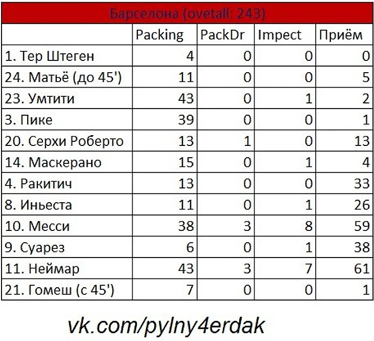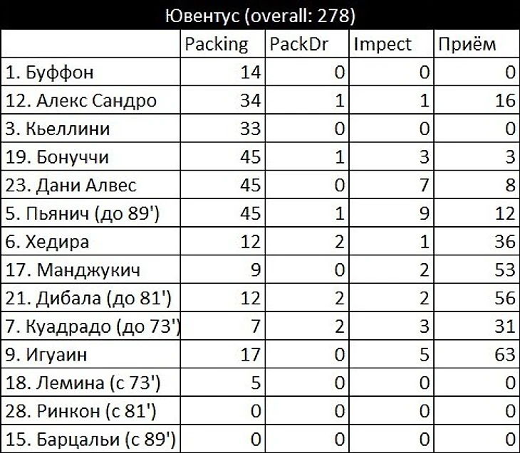Удивительно, как "Барса" умудрилась сделать Packing меньше, чем у "Ювентуса", при таких-то владении и количестве передач. Поперёк-назад играл не только Гомеш, который, как и в первом матче с ПСЖ набрал целых 7 баллов, но и вся команда. Во втором тайме очень хорошо сыграл Умтити, на уровне Неймар и Месси, но всего этого оказалось недостаточно. Кстати, цифры подтверждают визуальные впечатления - Иньеста просто отвратителен. Слишком далеко до топ-уровняЧто касается туринцев, цифры здесь не заоблачные, но понятно, в чём дело - в стиле игры. Однако поражает процент обострения. Отношение Impect/Packing 0,12 против 0,08 у "Барселоны". Дибала во втором тайме сильно прибавил в созидании. Скамейка ничего не сделала, но, как говорилось выше, её задачей являлась исключительно оборона. Лидер по Impect - Миралем Пьянич, он хороший пирлозаменитель, хоть я и далеко не сторонник сравнений. Также босниец лидер по xGChain. Дани Алвес помимо прилично проделанной работы в защите снова показал умение обострять.