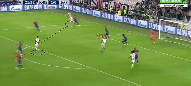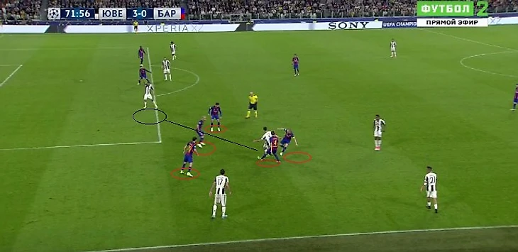 Само собой, "Ювентус" не без грешка. Пару раз гости успешно накрывали туринцев на их половине поля - в данном эпизоде Кьеллини, похоже, подзабыл, что матч не против "Пескары" и завозился с мячом, за что сразу же оказался накрыт Суаресом. Ещё один яркий похожий эпизод тоже был в первом тайме - Хедира занимался ерундой, и Месси отвоевал у него мяч, но тот отлетел к Суаресу, который находился вне игры. Да, Месси забил гол, но совершенно верно не засчитанный - уже после свистка. В остальных ситуациях "Ювентус", в основном, выходил из-под прессинга успешно. Не всегда с лёгкостью, часто на грани, но никто не говорил, что будет легко.