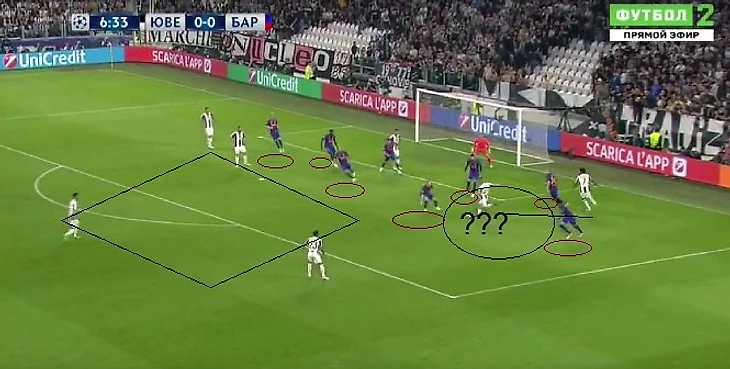 После такого нужно собираться и отыгрываться, особенно команде типа "Барселоны". При этом нужно постараться не раскрыться, не пропустить контратаку. Но как это сделать, если "Ювентус" выстраивается ВОТ ТАК?