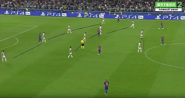 Тер Штеген сыграл через Маскерано, и тот сумел выиграть единоборство у боснийца из "Юве" - впрочем, всё было настолько рискованно, что чуть-чуть, и "Барса" попалась бы на ошибке. Она не ошиблась, но уже через пару секунд "Ювентус" всё равно не дал гостям развернуть атаку. Каталонцы при ТАКОМ организованном прессинге связаны по ногам, они теряются, и Аллегри знает это. Вероятно, он тоже прочитал наше превью. Логично ведь давить на слабое место? Конечно же, всё время так душить не получится. Так тогда "Ювентус" просто перекрывает все зоны для возможного паса и предоставляет "Барсе" право устроить усыпляющий перекат мяча между защитниками.