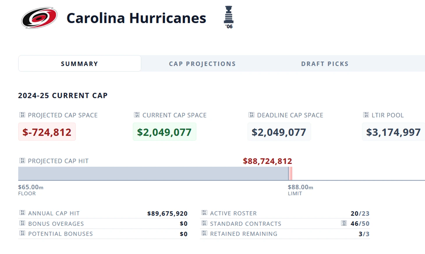 Даже с предполагаемыми цифрами Рантанена, нет проблем. Замена UFA 25 Холла и Котканиеми игроками с AAV по $1.0mln делает это. Уход UFA 25 Орлова и уход или переподписание Бёрнса на меньшую ЗП и т.д., дают немало места и возможность хорошо поработать в межсезонье.