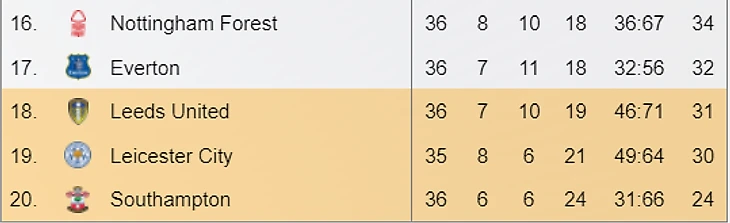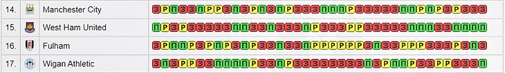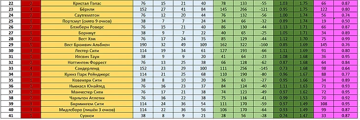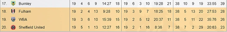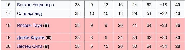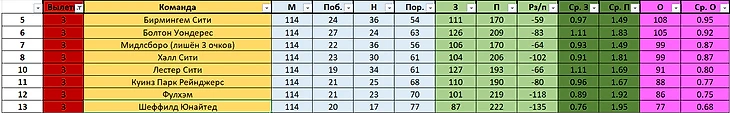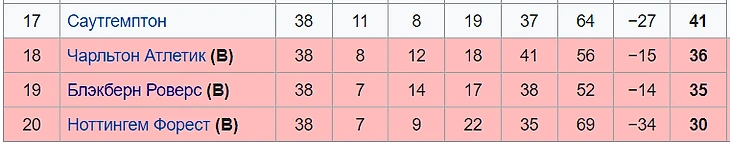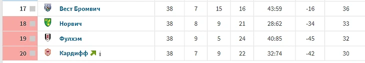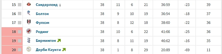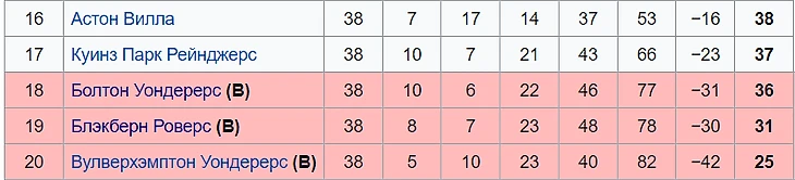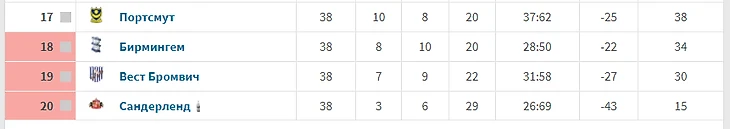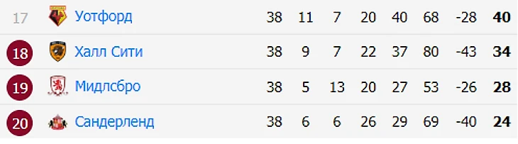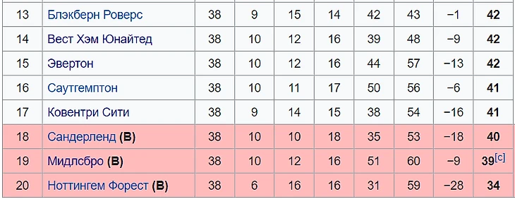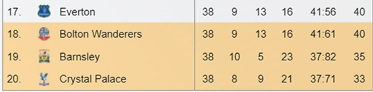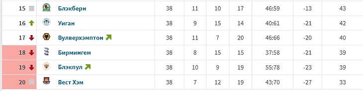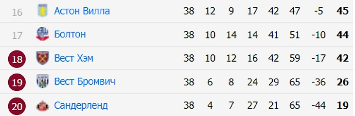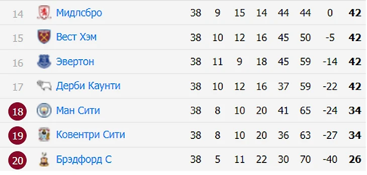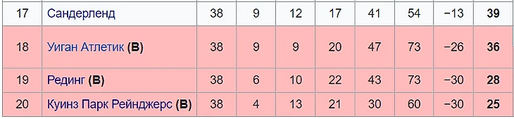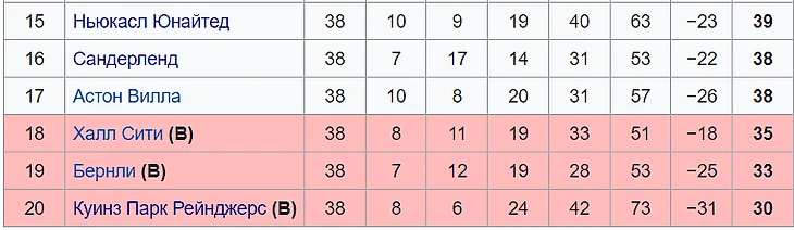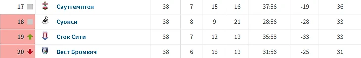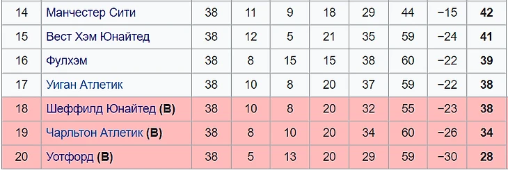 Так или иначе, каждая из вылетевших команд оказывалась худшей или по выездным матчам, или по домашним. А «Сток Сити» так и вообще был в зоне вылета по всем двум таблицам. Но и они могли оказаться на 17 месте (-3 очка).