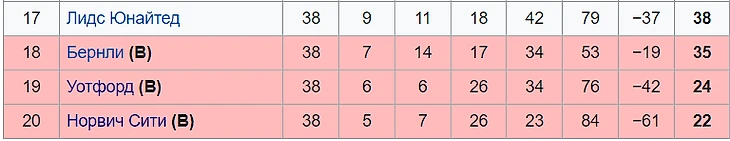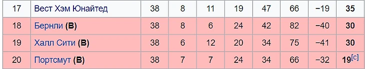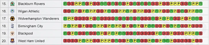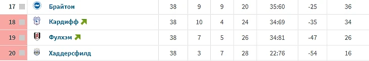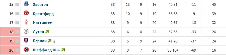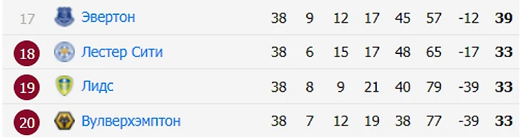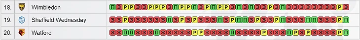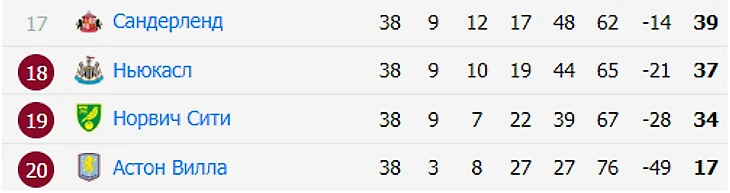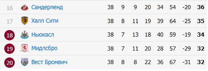 Серии из поражений (красные «З») объясняют, почему эти команды вылетели. Шеффилд Уэнсдей отметился поражение в гостях от «Ньюкасл Юнайтед» со счётом 0:8