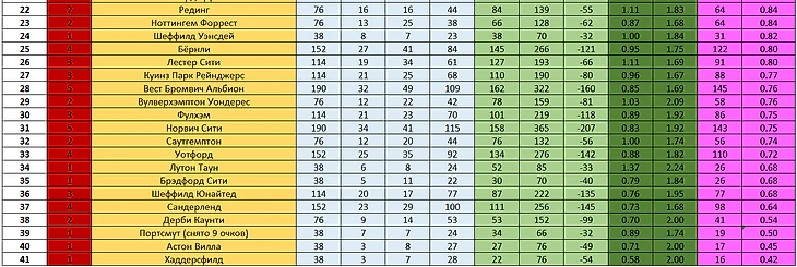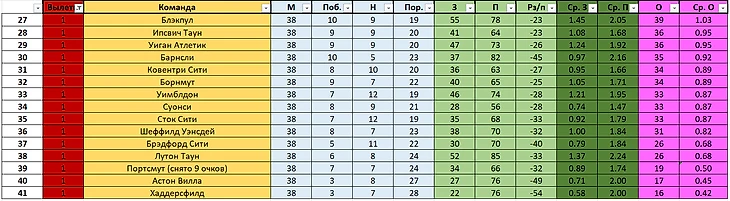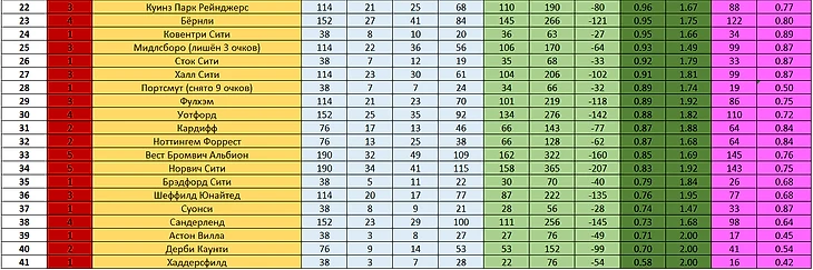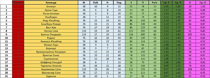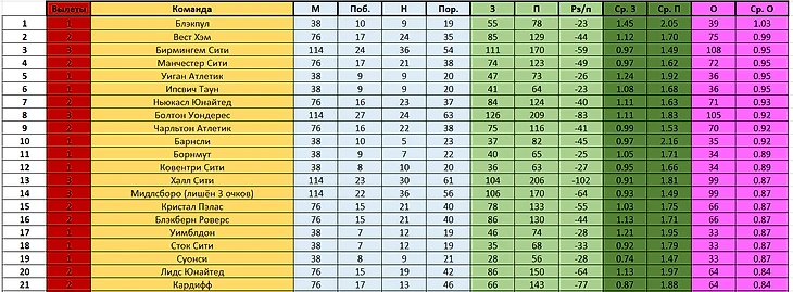 «Блэкпул», как уже написал, имеет самый высокий показатель – 1.03. За ним следуют «молотки» - 0.99, но они вылетали чаще.