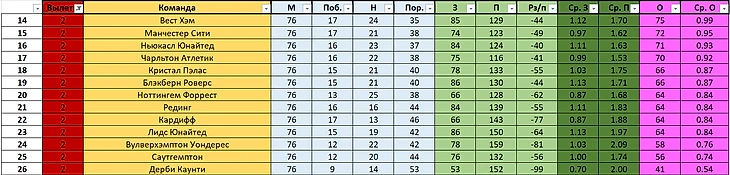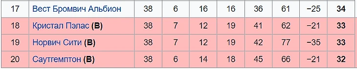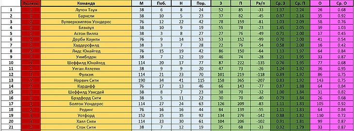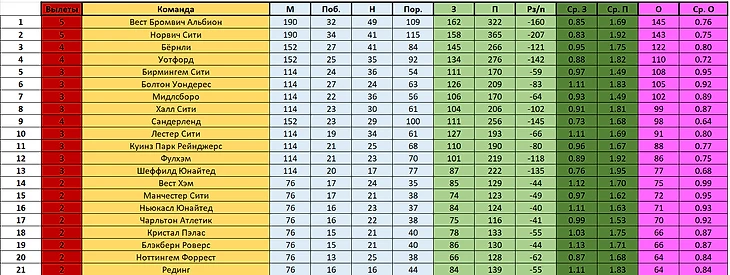 Так выглядит общая таблица вылетавших команд из Премьер-Лиги