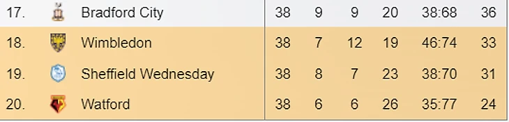 «Боро» сумели занять 12 место, а «странники» заняли последнее место, но при этом они в 1987 году вылетали в четвёртый дивизион, и за 8 лет сумели проделать такой путь.