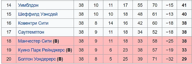 Судьба «Манчестер Сити» решалась в последнем туре, где «небесно-голубые» сыграли вничью с «Ливерпулем» 2:2, уступаю в 2 мяча после первого тайма, «красные» в том сезоне заняли 3 место. Нулевую ничью сыграли «святые» с «Уимблодон» и «Ковентри» с «Лидс». И «совы» сыграли вничью 1:1 с «Вест Хэм», отыгравшись на 89 минуте. Забрав очки у одного из лидеров чемпионата, «Манчестер Сити» вылетел лишь по разнице мячей. Заметьте, как мало забивали и пропускали в то время. Лучший показатель разницы З/П мячей у «Манчестер Юнайтед» всего «+38».
