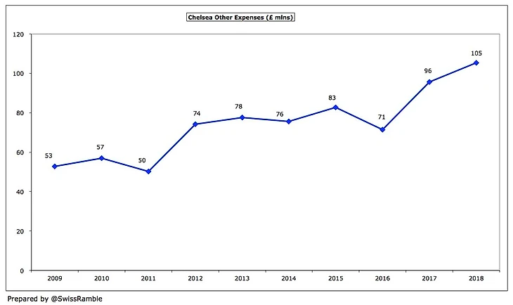 Прочие расходы включают в себя затраты на содержание стадиона, развитие инфраструктуры «Стэмфорд Бридж» и тренировочной базы в Кобхэме, подготовку к матчам, дорожные расходы, медицинское страхование и прочее. По этому пункту также наблюдается рост до 105 млн фунтов (на 10%). Расходы по планированию нового стадиона были записаны на счет Fordstam Limited.