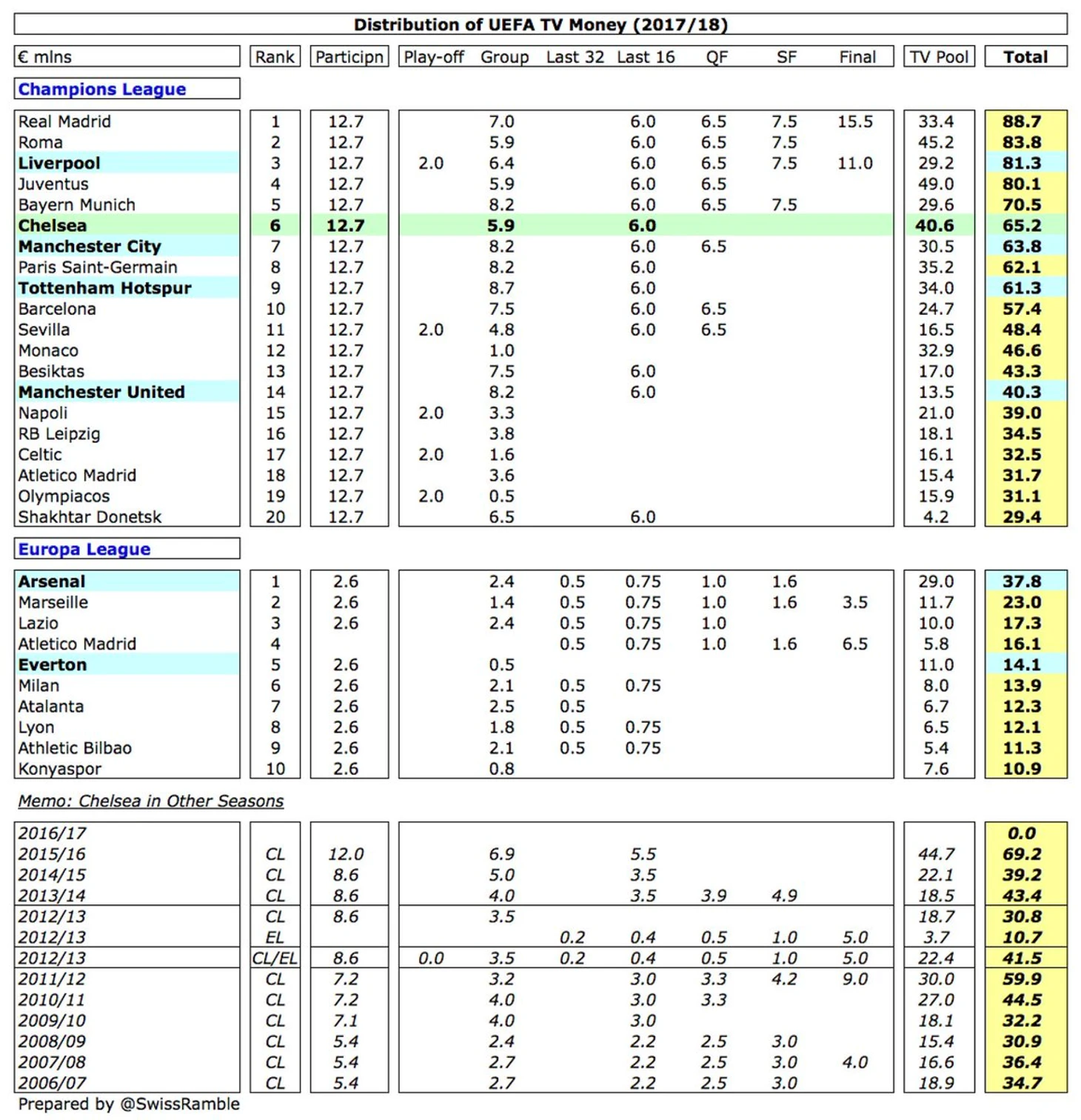 Выход в 1/8 финала Лиги чемпионов обеспечил «Челси» прибыль в 65 млн евро. Это шестой показатель в Европе (занявший первое место «Реал Мадрид» получил 89 млн евро, финалист «Ливерпуль» – 81 млн). Из английских клубов только мерсисайдцы заработали больше «Челси». «Манчестер Сити», который прошел на один раунд дальше, заработал на 1 млн евро меньше из-за того, что лондонцы получили больший ТВ-пул благодаря чемпионству в предыдущем сезоне.