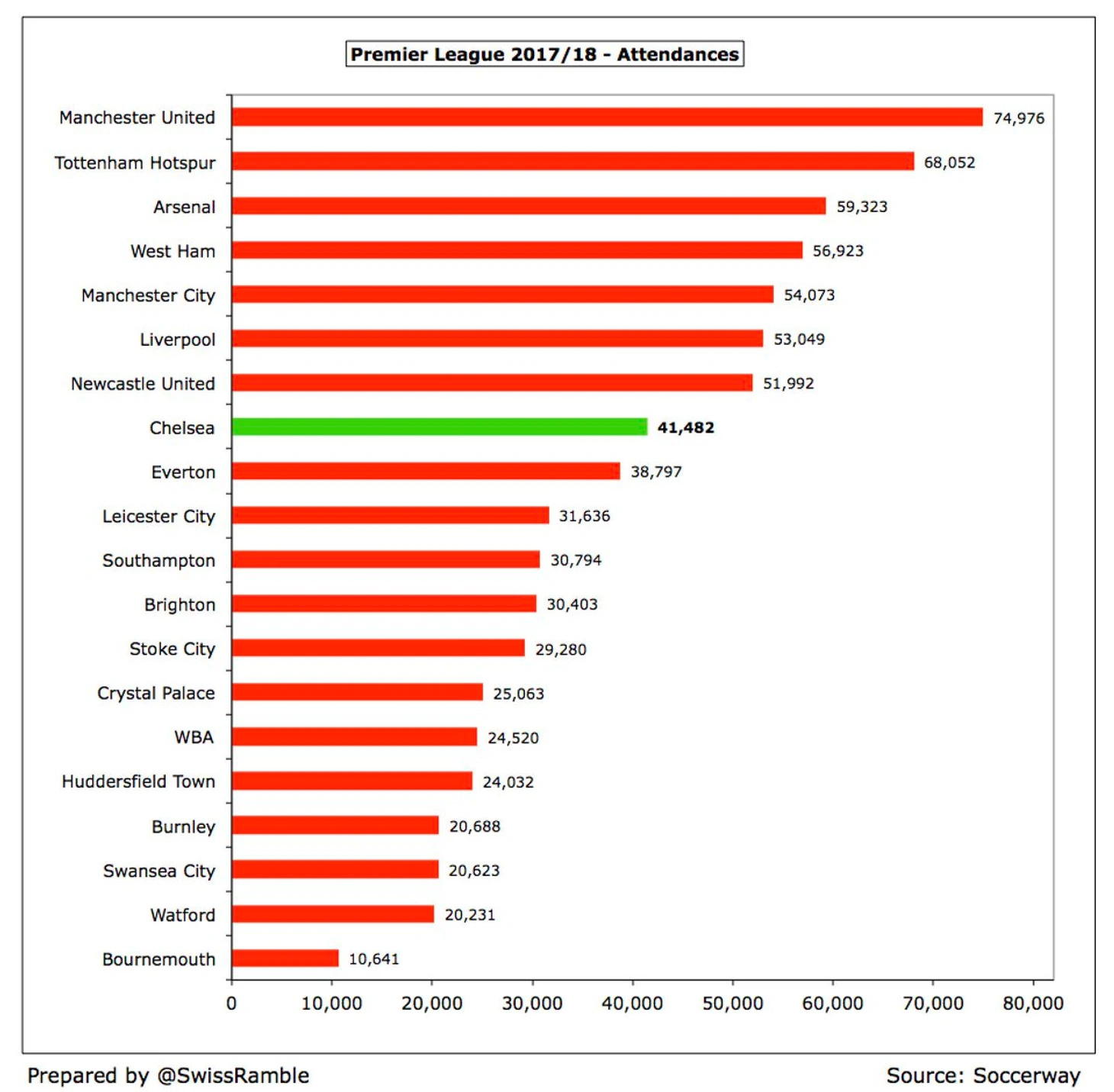 Несмотря на то, что билеты на каждый домашний матч «Челси» раскупаются практически полностью, средняя посещаемость в 41,5 тыс. – лишь восьмая в АПЛ и четвертая в Лондоне. Цены на абонементы заморожены с сезона-2011/12.